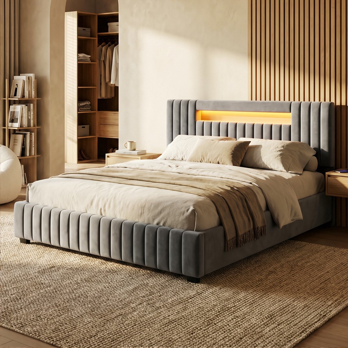 Strak, Slim en Ruimtelijk: Het Grijze Fluwelen Ottomaanse Bed Upgrade jouw slaapkamer met dit veelzijdige grijze bed van ADFBL. Dit bed combineert een tijdloos modern design met slimme functionaliteit. De neutrale grijze fluwelen bekleding past in elk interieur, terwijl de ingebouwde App-gestuurde LED-verlichting zorgt voor de perfecte sfeer. Heb je ruimtegebrek? Geen zorgen, onder het matras vind je een enorme opbergruimte voor al je spullen.