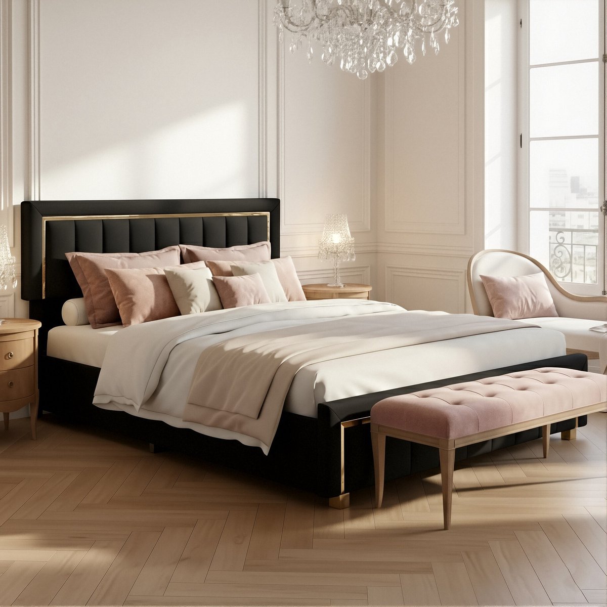 ADFBL Ottomaans Bed 160x200 cm Zwart - Fluweel Bed met Opbergruimte & Gouden Rand | Art Deco Hotel Chique