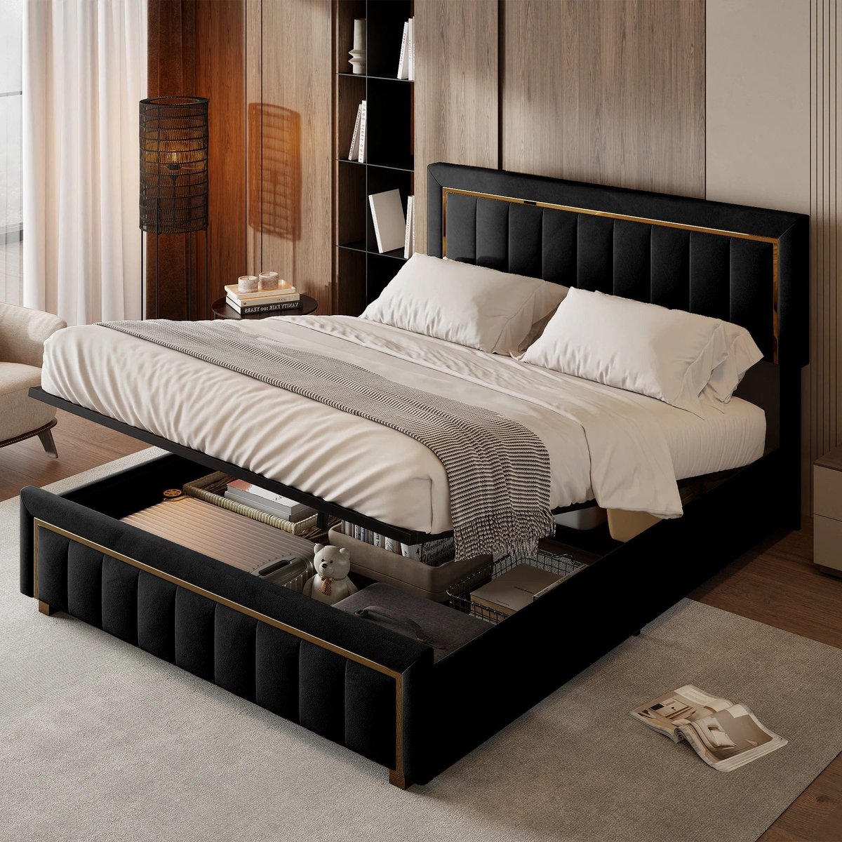 Stijlvol en praktisch: platformbed met opbergruimte Dit moderne platformbed combineert een strak design met slimme functionaliteit, perfect voor jouw slaapkamer. De zwarte kleur en het zachte, beklede hoofdbord geven een elegante en tijdloze uitstraling die moeiteloos past in diverse interieurstijlen.