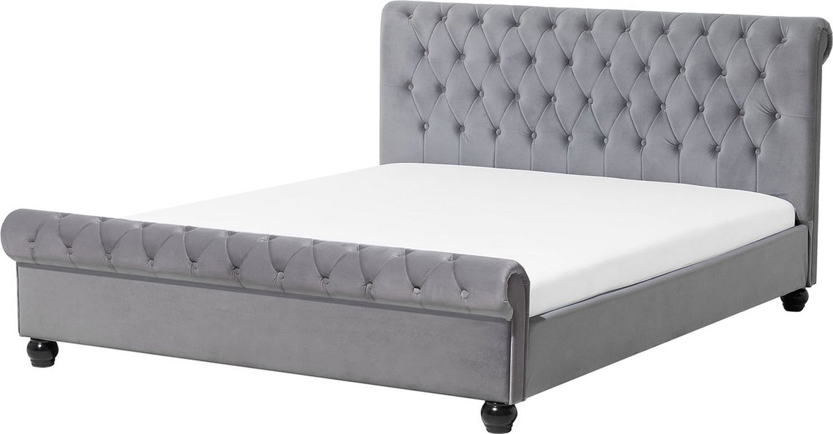 Stijlvol fluwelen bed in klassiek lichtgrijs. Breng je slaapkamer naar een hoger niveau met dit unieke luxe bed. Een elegant opgerold hoofdbord en een laag front completeren het chique silhouet van het frame. Het bed is gemaakt van zachte, delicate fluwelen stof in een zwarte tint, die gemakkelijk te onderhouden en aangenaam is om aan te raken. Het decoratieve handwerk met ronde knopen is een perfecte afwerking van dit opvallende stuk. Dit bed is een must-have voor vintage, moderne retro of Engelse slaapkamers.