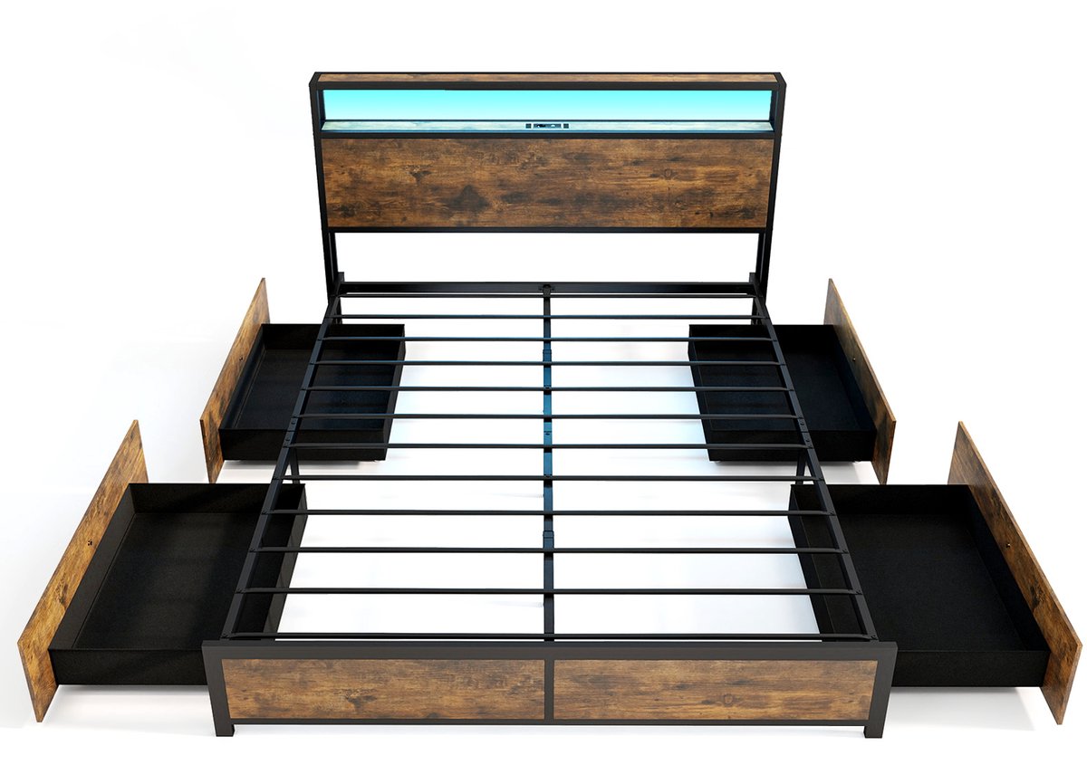 COSTWAY Bed met ledverlichting, laadstation en 4 laden, opbergbed met hoofdeinde en lattenbodem, industrieel bedframe, metalen bed, tweepersoonsbed 200 x 160 cm
