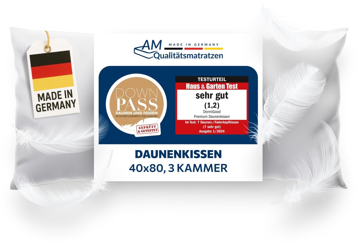 Volgepropt en knuffelig zacht – Het hoogwaardige 3 compartimenten donskussen (40 x 80 cm) van DormiGood is met 540 gram hoogwaardige Franse dons en veren gevuld. Dierenwelzijn staat bij ons op de eerste plaats: Wij hechten een grote waarde aan het feit dat onze dons gegarandeerd niet van de levende pluk stamt.100% Natuur – Ons donskussen heeft 3 compartimenten. De beide buitenkamers zijn voor 100% met zachte Franse dons gevuld (100g). In de binnenkamer bevinden zich 85% veren en wederom 15% dons van dezelfde hoge kwaliteit (440g). Het verenaantal is belangrijk zodat het kussen zijn noodzakelijke ondersteuneningskracht niet verliest.Ademend vermogen en ligcomfort – Het inlegwerk van het kussen bestaat voor 100% uit hoogwaardig bewerkt katoen. Het katoen heeft een knuffelige structuur en is bijzonder mee-ademend. Met de praktische draag- en bewaartas kan het kussen na gebruik ruimtebesparend opgeborgen worden.Gecertificeerde kwaliteit Made in Germany – Ons donskussen draagt zowel het Downpass (vroeger Traumpass) als het Nomite-keurmerk en is daarmee optimaal geschikt voor mensen met een allergie. Onze producten worden tussen het Westerwald en het Taunusgebergte, volledig in Duitsland geproduceerd.Onze tevredenheidsbelofte: Wij zijn van onze kwaliteit overtuigd en willen dat u rondom tevreden bent! Daarom kunt u al onze producten 30 dagen vrijblijvend en risicovrij op uw eigen bed uitproberen. Bent u tegen verwachting in niet tevreden, dan kunt u ze kostenloos naar ons terugsturen - tegen een volledige vergoeding van de koopprijs. Zonder "mitsen" en "maren"!
