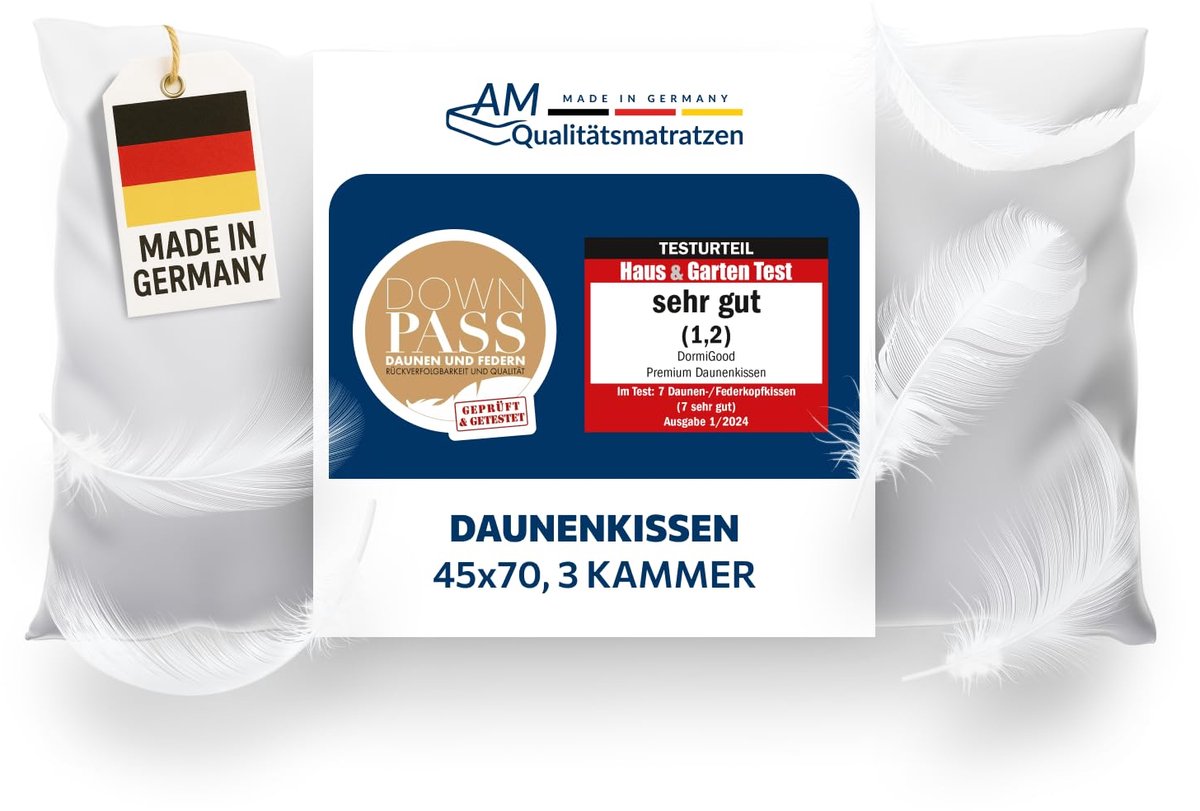 Volgepropt en knuffelig zacht – Het hoogwaardige 3 compartimenten donskussen (45 x 70 cm) van DormiGood is met 520 gram hoogwaardige Franse dons en veren gevuld. Dierenwelzijn staat bij ons op de eerste plaats: Wij hechten een grote waarde aan het feit dat onze dons gegarandeerd niet van de levende pluk stamt.100% Natuur – Ons donskussen heeft 3 compartimenten. De beide buitenkamers zijn voor 100% met zachte Franse dons gevuld (80g). In de binnenkamer bevinden zich 85% veren en wederom 15% dons van dezelfde hoge kwaliteit (440g). Het verenaantal is belangrijk zodat het kussen zijn noodzakelijke ondersteuneningskracht niet verliest.Ademend vermogen en ligcomfort – Het inlegwerk van het kussen bestaat voor 100% uit hoogwaardig bewerkt katoen. Het katoen heeft een knuffelige structuur en is bijzonder mee-ademend. Met de praktische draag- en bewaartas kan het kussen na gebruik ruimtebesparend opgeborgen worden.Gecertificeerde kwaliteit Made in Germany – Ons donskussen draagt zowel het Downpass (vroeger Traumpass) als het Nomite-keurmerk en is daarmee optimaal geschikt voor mensen met een allergie. Onze producten worden tussen het Westerwald en het Taunusgebergte, volledig in Duitsland geproduceerd.Onze tevredenheidsbelofte: Wij zijn van onze kwaliteit overtuigd en willen dat u rondom tevreden bent! Daarom kunt u al onze producten 30 dagen vrijblijvend en risicovrij op uw eigen bed uitproberen. Bent u tegen verwachting in niet tevreden, dan kunt u ze kostenloos naar ons terugsturen - tegen een volledige vergoeding van de koopprijs. Zonder "mitsen" en "maren"!