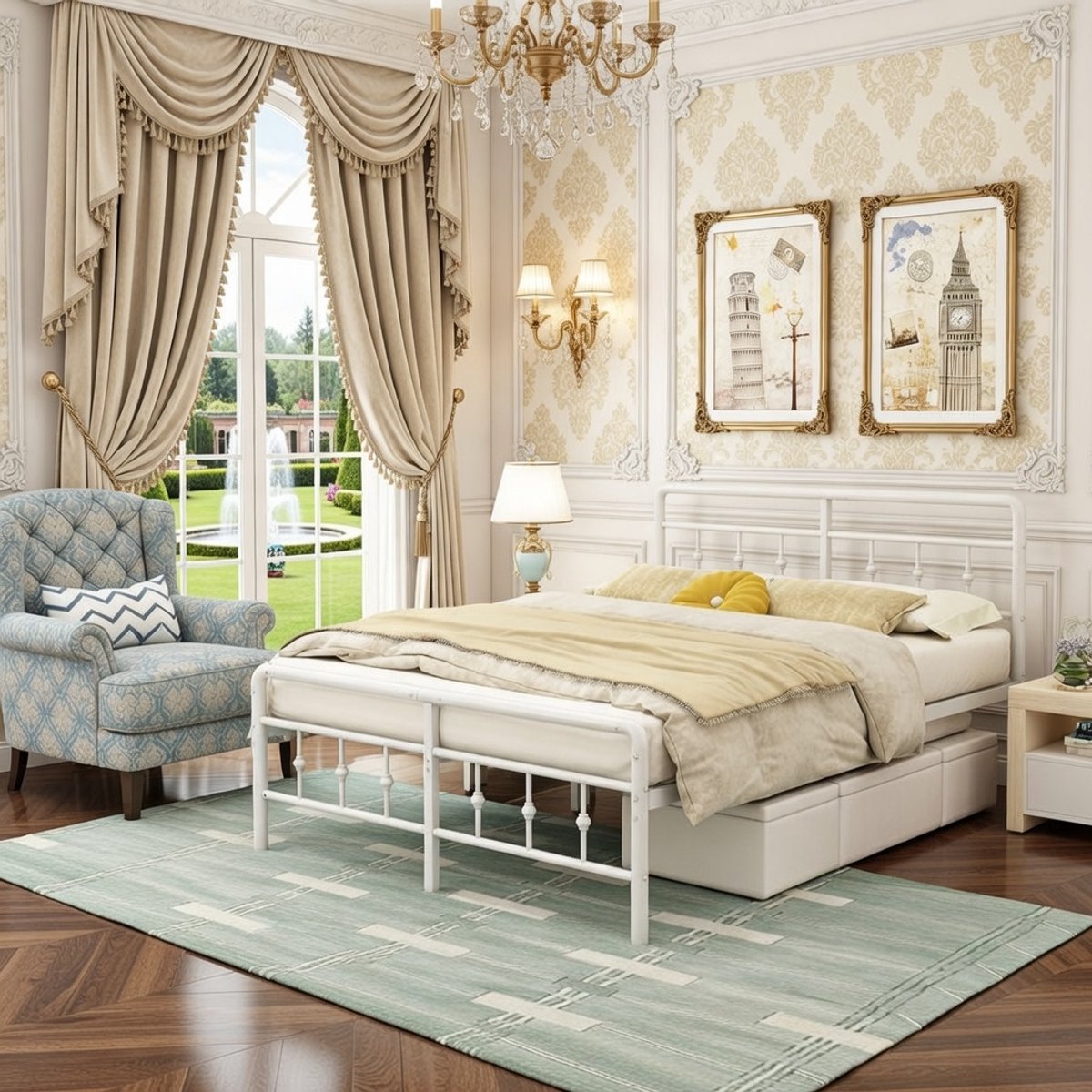 Elegant Victoriaans Metalen Tweepersoonsbed 160x200 cm - Stil & Duurzaam Bedframe met Hoofd- en Voeteneinde, Stalen Lattenbodem, Wit - Eenvoudig te Monteren & Veel Opbergruimte Casa Serena