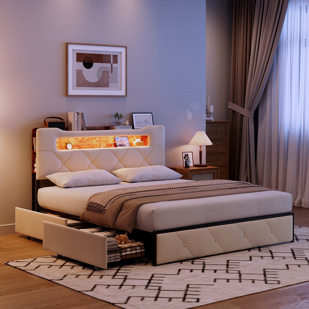 Gestoffeerd bed 140×200 cm in beige – zachte fluwelen bekleding, hoofdeinde met opbergruimte en USB-poort, 4 lades onder het bed voor royale opbergruimte