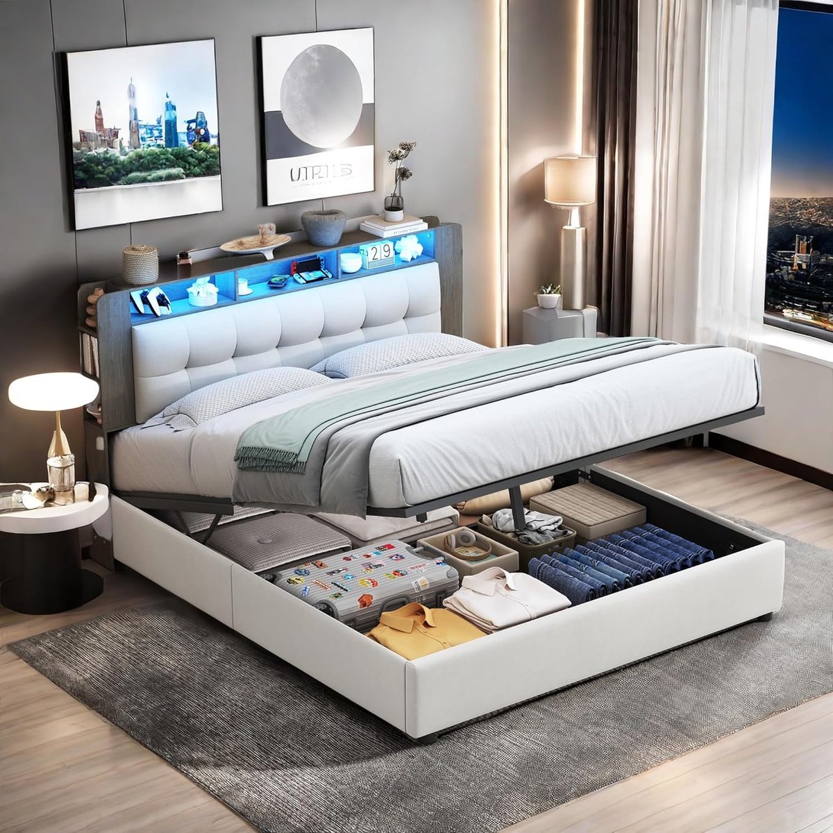Hoogwaardig gestoffeerd tweepersoonsbed (140 x 200 cm) in de kleur beige, ideaal voor het optimaliseren van de ruimte in kleinere slaapkamers. Dit bed biedt een slimme oplossing met grote opbergruimte onder het bed, toegankelijk via een hydraulisch mechanisme, perfect voor het opbergen van kleding, dekens en accessoires. Het hoofdeinde is multifunctioneel en beschikt over praktische opbergvakken voor alledaagse spullen. Daarnaast is het bed voorzien van sfeervolle LED-verlichting die aanpasbaar is via een afstandsbediening met 20 statische kleuren en 22 dynamische modi. Het bed is gemaakt van zacht fluweel en vereist montage. Matras niet inbegrepen.