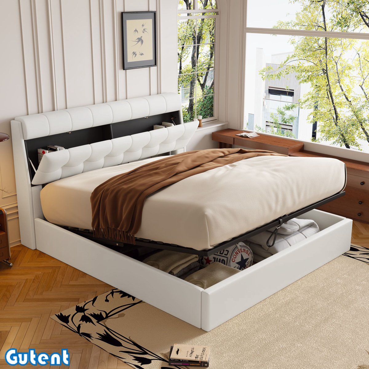 Gutent Gestoffeerd bed-140x190cm-Hydraulisch bed-Opbergruimte aan het hoofdeinde van het bed-Polyurethaan-Geen matras-Wit