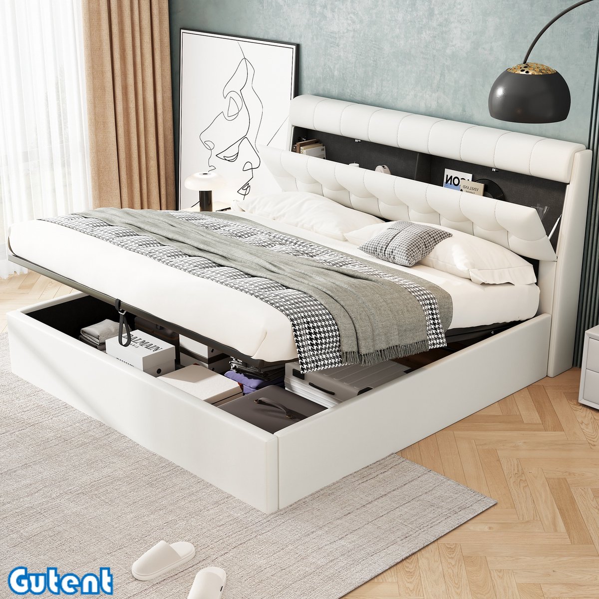 Gutent Gestoffeerd bed-140x200cm-Hydraulisch bed-Opbergruimte aan het hoofdeinde van het bed-Polyurethaan-Geen matras-Wit