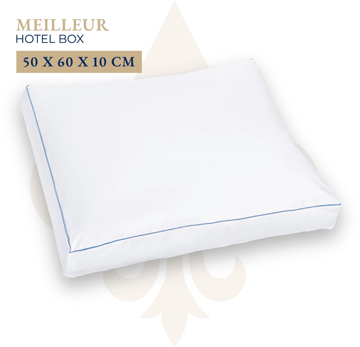 Binnen de collectie is ook het Meilleur Hotel Box hoofdkussen opgenomen. Dit luxe gestept hoofdkussen is uitgevoerd met een micro tijk en gevuld met Syndon® holle polyester vezels. Met een vulgewicht van circa 800 gram biedt het kussen een comfortabel en aangenaam liggevoel. Dankzij het formaat van 50 x 60 x 10 cm is het kussen geschikt voor dagelijks gebruik en ontworpen om prettig comfort en goede ondersteuning te bieden.
