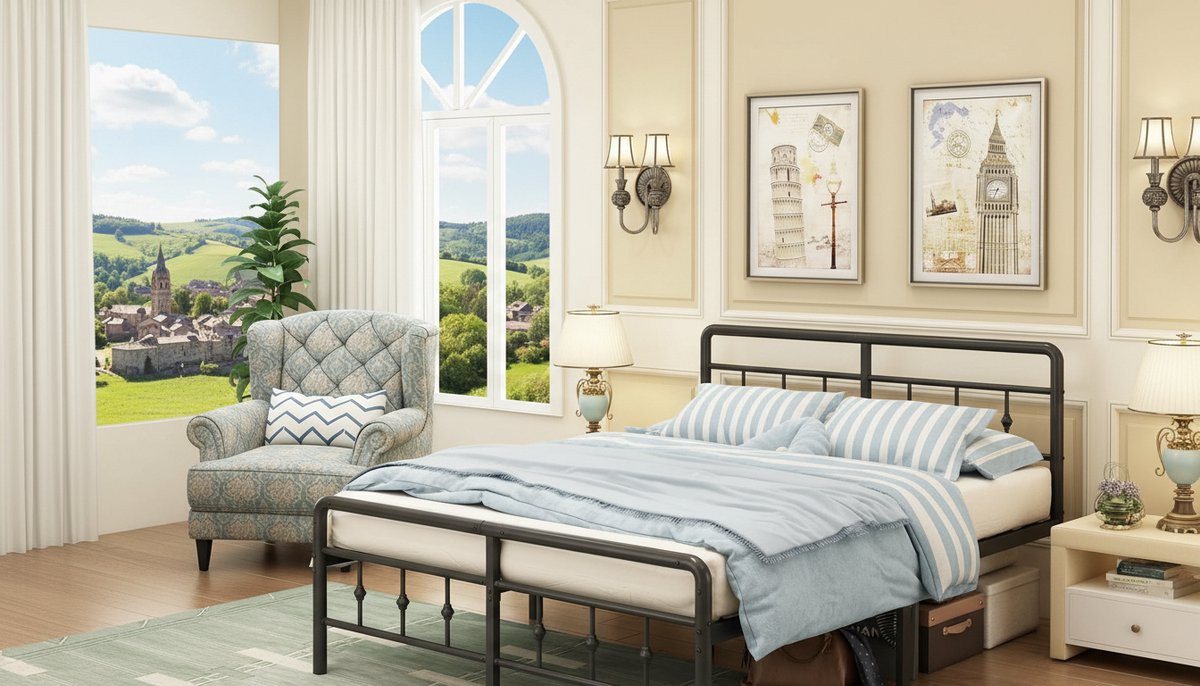 metalen bedframe, tweepersoonsbed, double bed, zwart bed, duurzaam bed, bed met stalen lattenbodem, Victoriaans hoofdeinde, opbergruimte onder bed, stil bed, heavy duty bed, Casa Velluto bed, gemakkelijk te monteren bed
