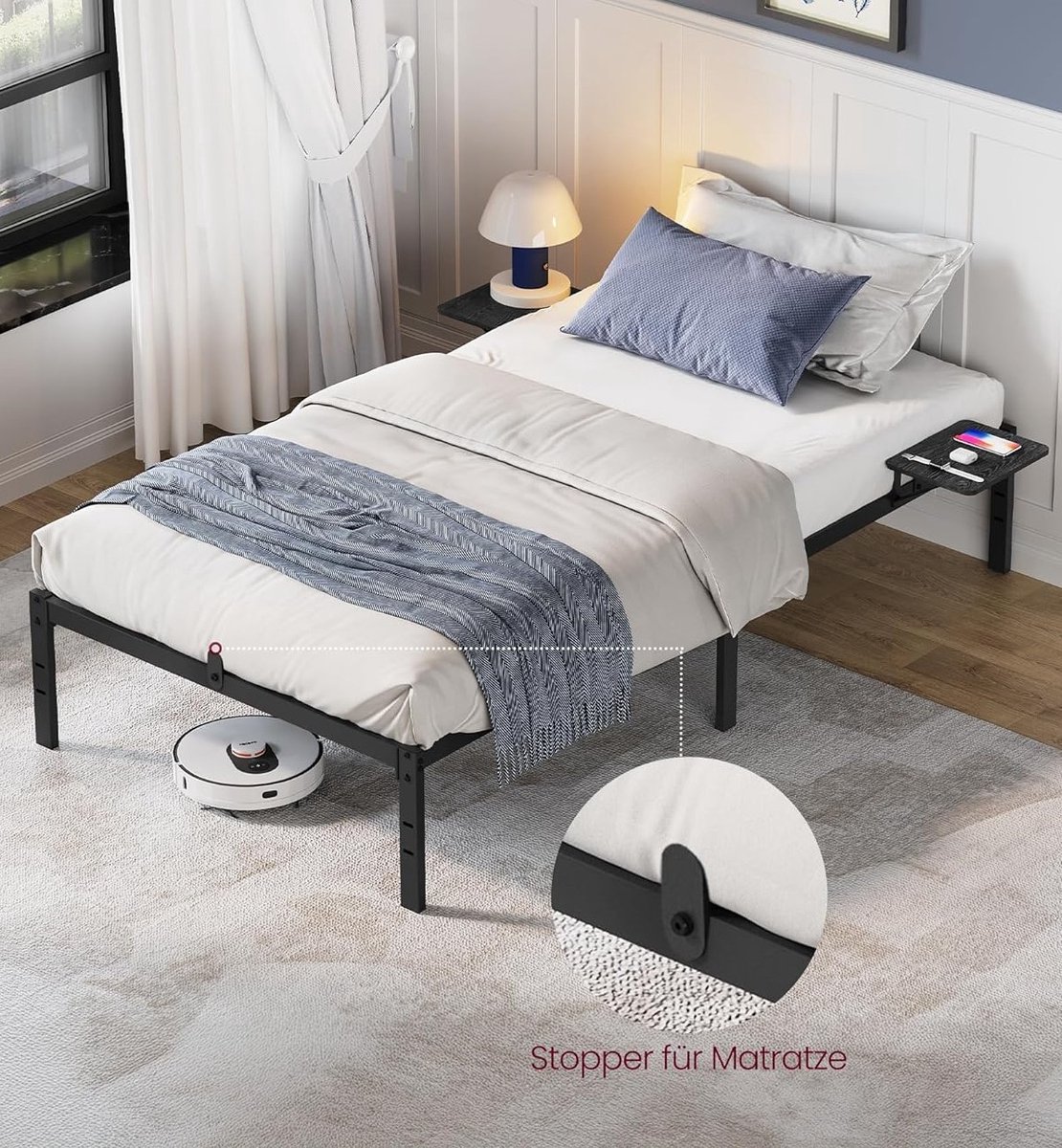 Met een afstand van 41,3 cm tussen vloer en draagbalk is er voldoende ruimte voor opbergdozen, koffers of een robotstofzuiger voor gemakkelijke schoonmaak.