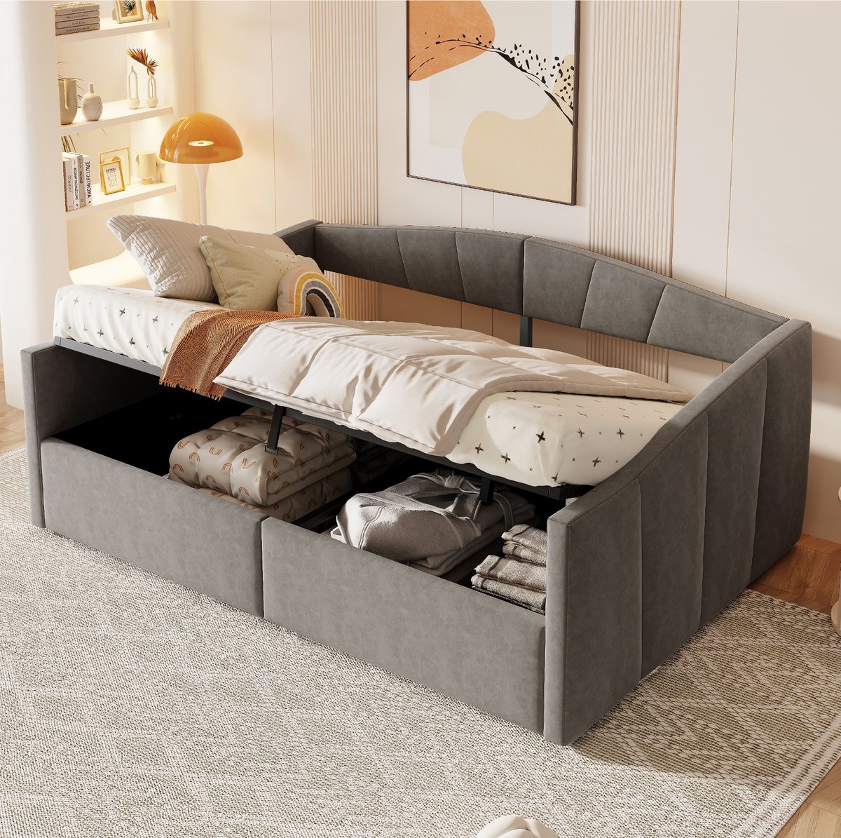 IntroSection: Deze gestoffeerde slaapbank combineert een bed en zitmeubel in één en past door de grijze fluwelen bekleding met streeppatroon in diverse interieurs. Dankzij de hydraulische opbergruimte onder het ligvlak berg je kleding en textiel overzichtelijk op, terwijl de rugleuning en armleuningen extra steun geven bij zitten, lezen of ontspannen.Highlights: 2-in-1 ontwerp: Te gebruiken als slaapbank en als zitplek in één ruimte. Hydraulische opbergruimte: Verborgen opbergruimte onder het bed voor kleding en linnengoed. Ruimtebesparend: Praktisch voor slaapkamer, woonkamer, logeerkamer of kleine woning. Zachte fluwelen stof: Huidvriendelijke bekleding met klassiek streeppatroon in grijs. Rugleuning en armleuningen: Bieden ondersteuning voor comfortabel zitten en liggen. Lattenbodem inbegrepen: Stevige ondersteuning voor het matras en een stabiele basis. Solide draagkracht: Ontworpen met een belastbaarheid tot 300 kg voor dagelijks gebruik. Geschikt als leeshoek: Ideaal als dagbank voor ontspannen, lezen of een extra slaapplaats. Montage met 2 personen: Inclusief gereedschap, geschatte montagetijd ongeveer 1 uur. Description: Dit gestoffeerde slaapsofa is ontworpen voor wie flexibel met ruimte wil omgaan. Overdag gebruik je het als dagbank met rug- en armleuningen voor ondersteuning, en ’s avonds als bed van 140x200 cm. De hydraulische lift maakt de opbergruimte onder het ligvlak makkelijk bereikbaar, zodat je kleding, beddengoed of seizoensspullen netjes uit het zicht opbergt. De fluwelen bekleding met streeppatroon geeft een rustige, klassieke uitstraling en voelt prettig aan. De lattenbodem ondersteunt het matras en draagt bij aan een stabiele en duurzame constructie. Afmetingen & Details: Producttype: Gestoffeerd bed slaapbank Ligmaat: 140 x 200 cm Kleur: Grijs Materiaal: Fluweel, Metaal, Multiplex, MDF Totale afmetingen: 212 x 145 x 62 cm Aantal latten: 26 Aanbevolen matrashoogte: 10 tot 12 cm Gewicht: 47 kg Maximale belasting: 300 kg Montage: Volledige montage vereist Geschatte montagetijd: Ongeveer 1 uur Aanbevolen aantal personen voor montage: 2 Leveringsomvang: 1 x Gestoffeerde slaapbank (bedframe) 1 x Lattenbodem 1 x Montagemateriaal en gereedschap 1 x Montagehandleiding Aantal pakketten: 3 Opmerkingen: Matrassen zijn niet inbegrepen. Gebruik bij voorkeur geen elektrisch gereedschap tijdens de montage. Detailmaten kunnen afwijken, raadpleeg de maatafbeelding voor aanvullende informatie.