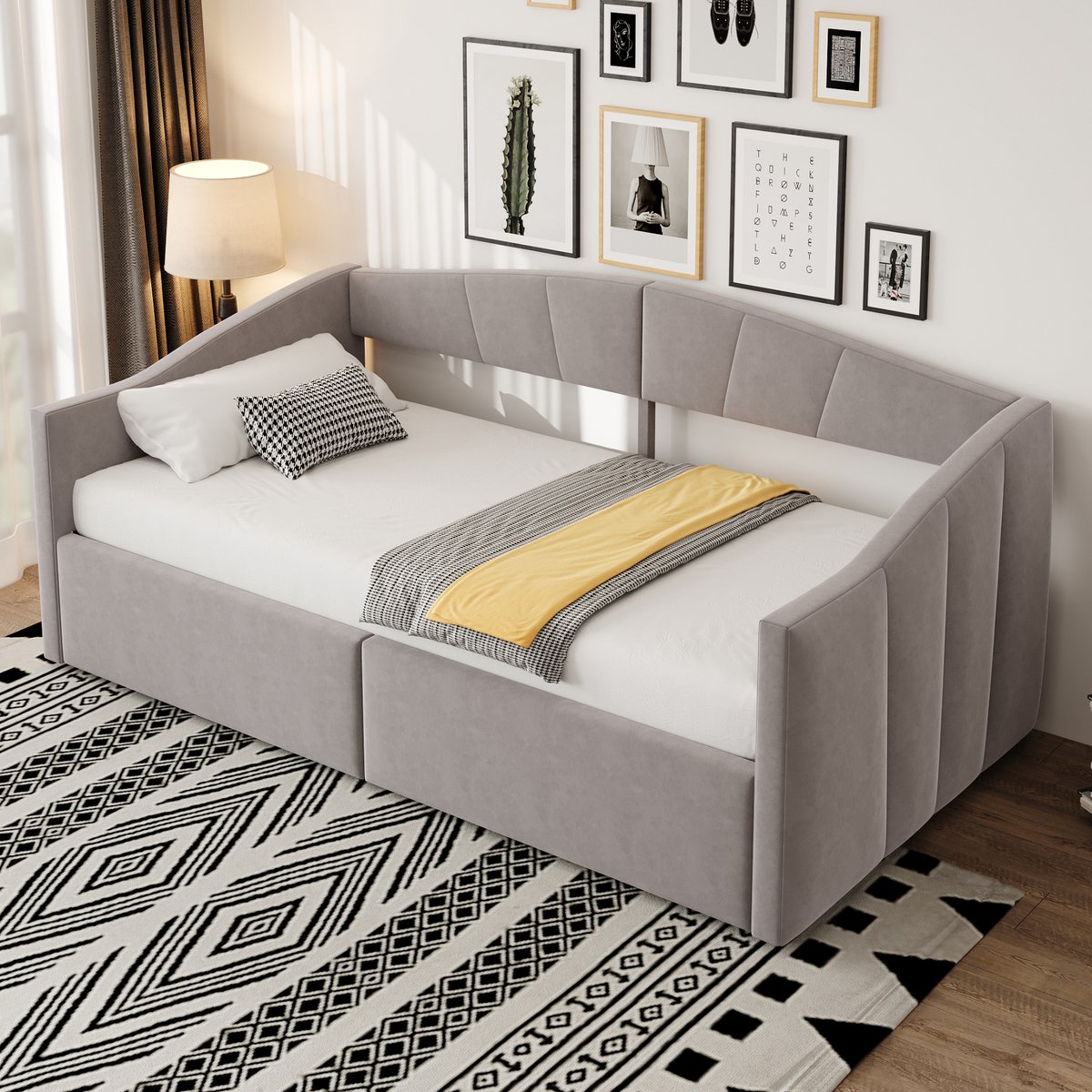 Bed en bank in één: te gebruiken als slaapplaats en als zitplek in dezelfde ruimte. Hydraulische opbergruimte: verborgen ruimte onder het bed voor kleding, beddengoed en meer. Ruimtebesparend ontwerp: geschikt voor logeerkamers, jeugdruimte en kleinere woningen. Fluweel met streeppatroon: huidvriendelijke bekleding met een klassieke, rustige uitstraling. Rugleuning en armleuningen: biedt steun bij zitten, lezen of ontspannen liggen. Lattenbodem inbegrepen: ondersteunt de matras en draagt bij aan een stabiele ligging. Stevige draagkracht: belastbaar tot 250 kg volgens productspecificatie. Geschikte matrasmaat: ontworpen voor 90x200 cm met aanbevolen dikte 10 tot 12 cm. Compleet te monteren: montage met meegeleverde gereedschappen, geschatte tijd circa 1 uur. Afmetingen & Details: Producttype: Gestoffeerd Slaapbankbed Kleur: Lichtgrijs Ligmaat: 90 x 200 cm Totale afmetingen: 212 x 95 x 62 cm Materiaal: Fluweel, Metaal, Multiplex, MDF Lattenbodem: Ja Aantal latten: 13 Opbergruimte: Ja, onder het ligvlak met hydraulisch liftsysteem Aanbevolen matrasdikte: 10 tot 12 cm Maximale belasting: 250 kg Productgewicht: 38 kg Aantal pakketten: 2 Leveringsomvang: 1 x Gestoffeerd Slaapbankbed 90x200 cm 1 x Lattenbodem 1 x Montagemateriaal en gereedschap 1 x Montagehandleiding Opmerkingen: Matrassen zijn niet inbegrepen. Volledige montage vereist, aanbevolen met 2 personen. Vermijd elektrisch gereedschap volgens de instructie. Afmetingen kunnen licht afwijken, raadpleeg indien beschikbaar de maatafbeelding.