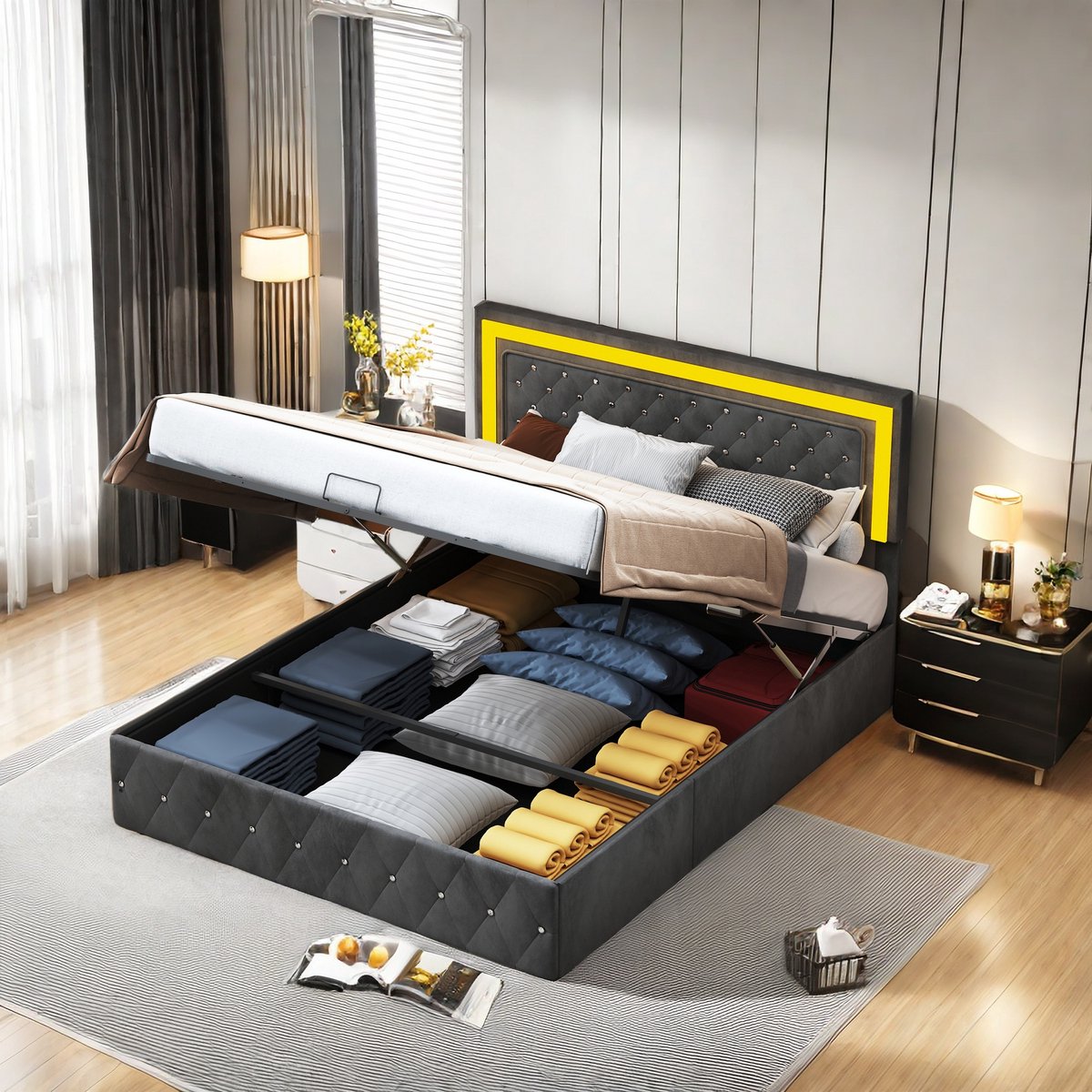 Modern gestoffeerd bed, LED tweepersoonsbed, 160 x 200 cm, hydraulisch bed met opbergruimte, elegant fluwelen bedframe zonder matras (verzonden in 2 pakketten)