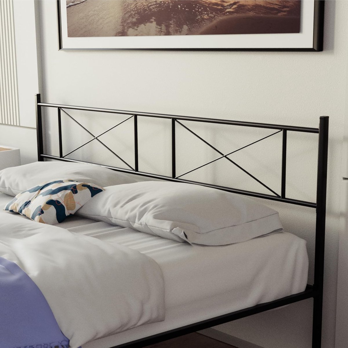 Moderne Elegantie en Duurzaam Ontwerp Het hoofdeinde van zwart metaal met een modern kruisontwerp geeft de slaapkamer een stijlvolle en moderne uitstraling. Het bedframe is gemaakt van hoogwaardig geverfd metaal en combineert duurzaamheid en stabiliteit met een elegante look.