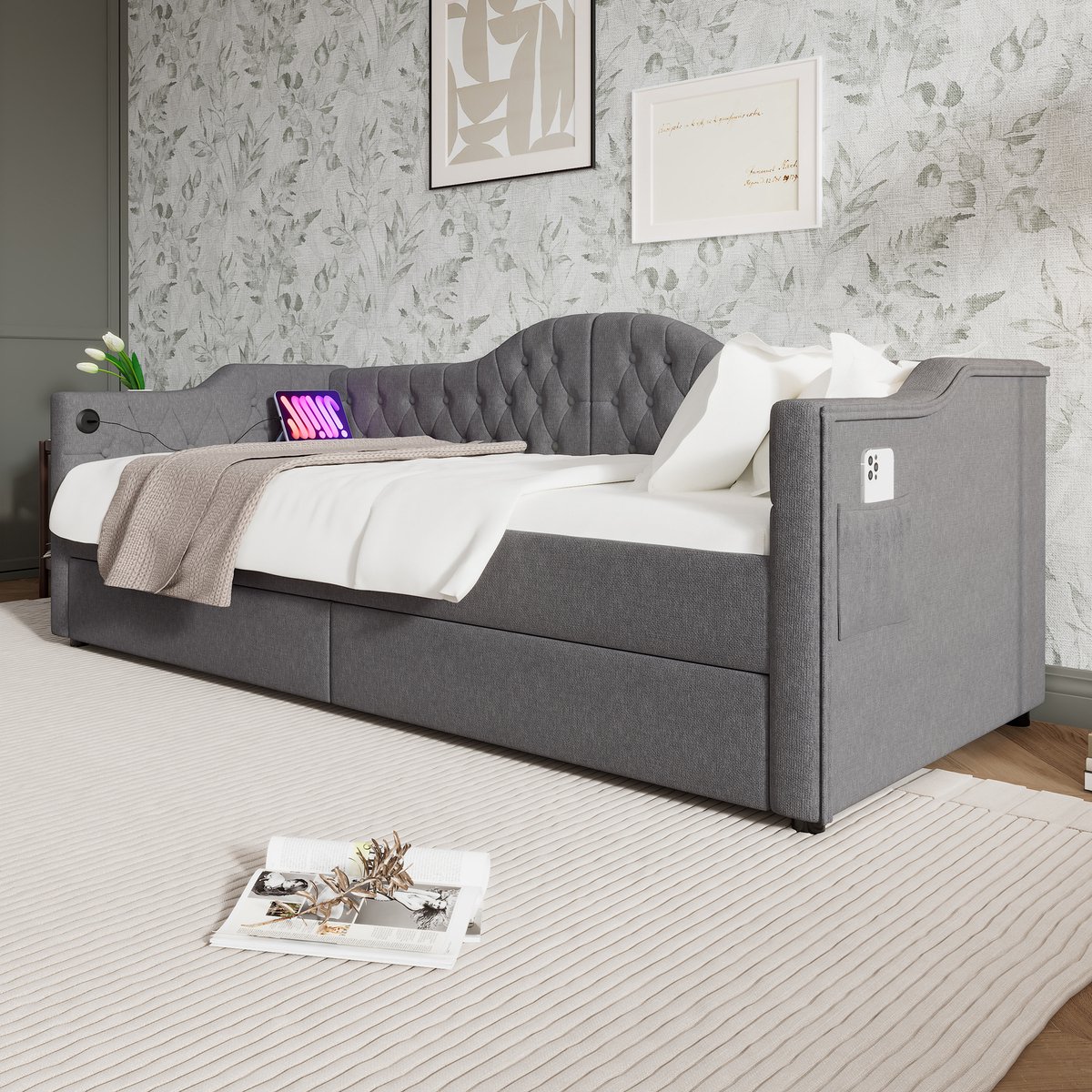MODFU Daybed 90x200 cm linnen grijs met USB‑C en 2 lades – vintage getuft hoofdeinde