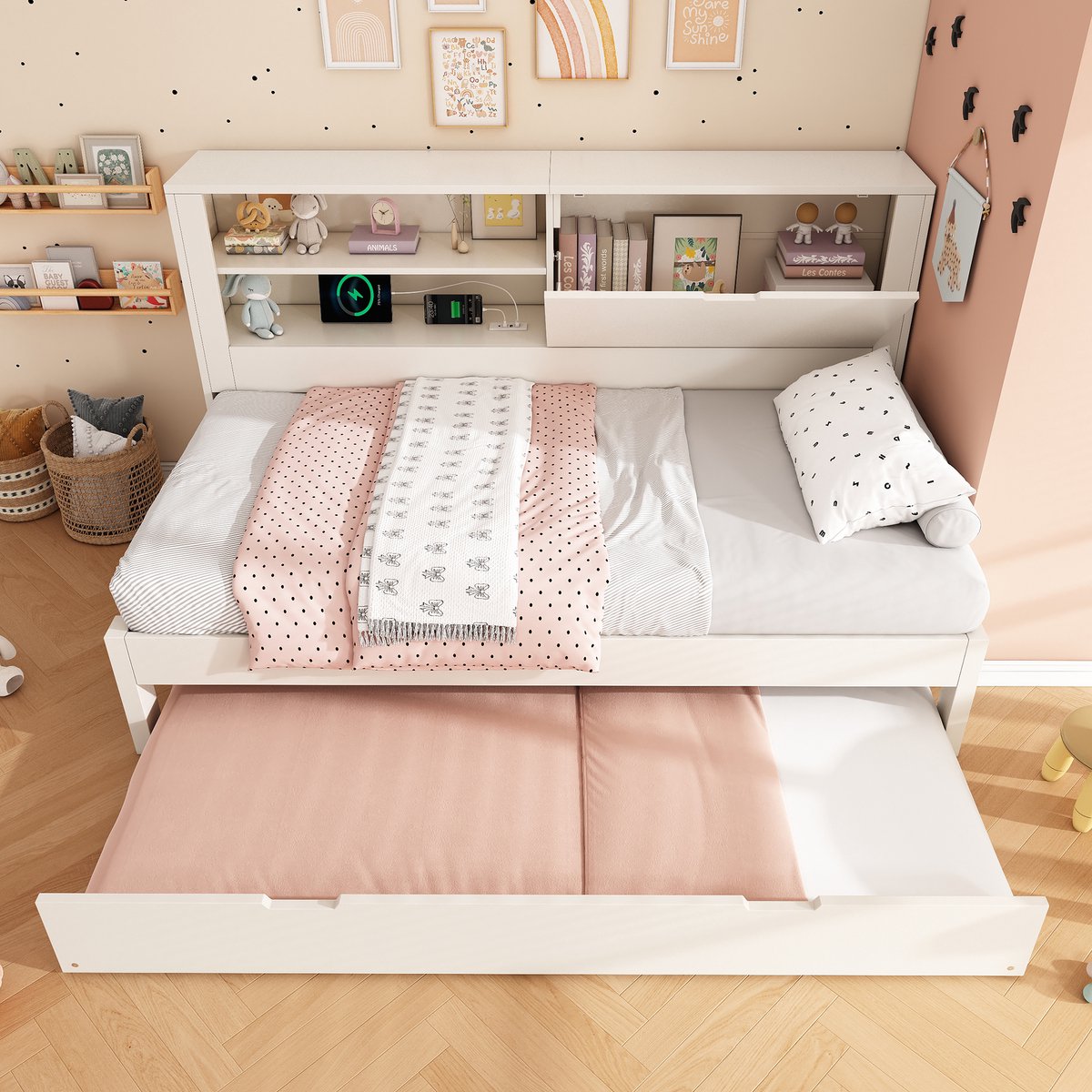 Deze strak vormgegeven slaapbank in wit hout combineert een volwaardig bed met een handig uitschuifbed en slimme opbergruimte in de rugwand. Ideaal voor logees, een tienerkamer, studio of woonkamer, met extra gemak dankzij de geïntegreerde oplaadpunten en een rustige, stabiele bedconstructie.