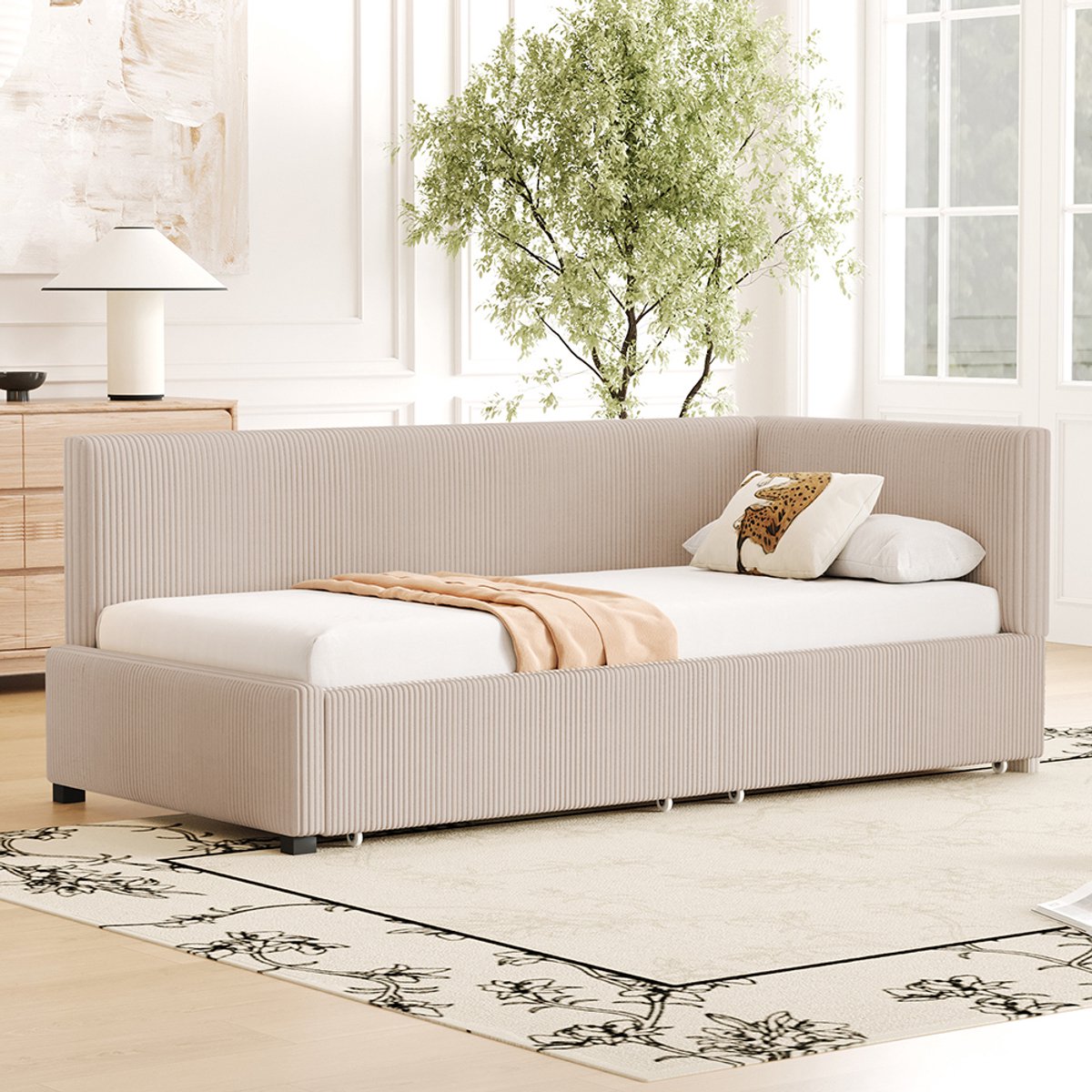 Pugsdrly Slaapbank met bekleding 90*200 Multifunctioneel bed met 2 grote opberglades en lattenbodem, huidvriendelijke fluweelstof beige