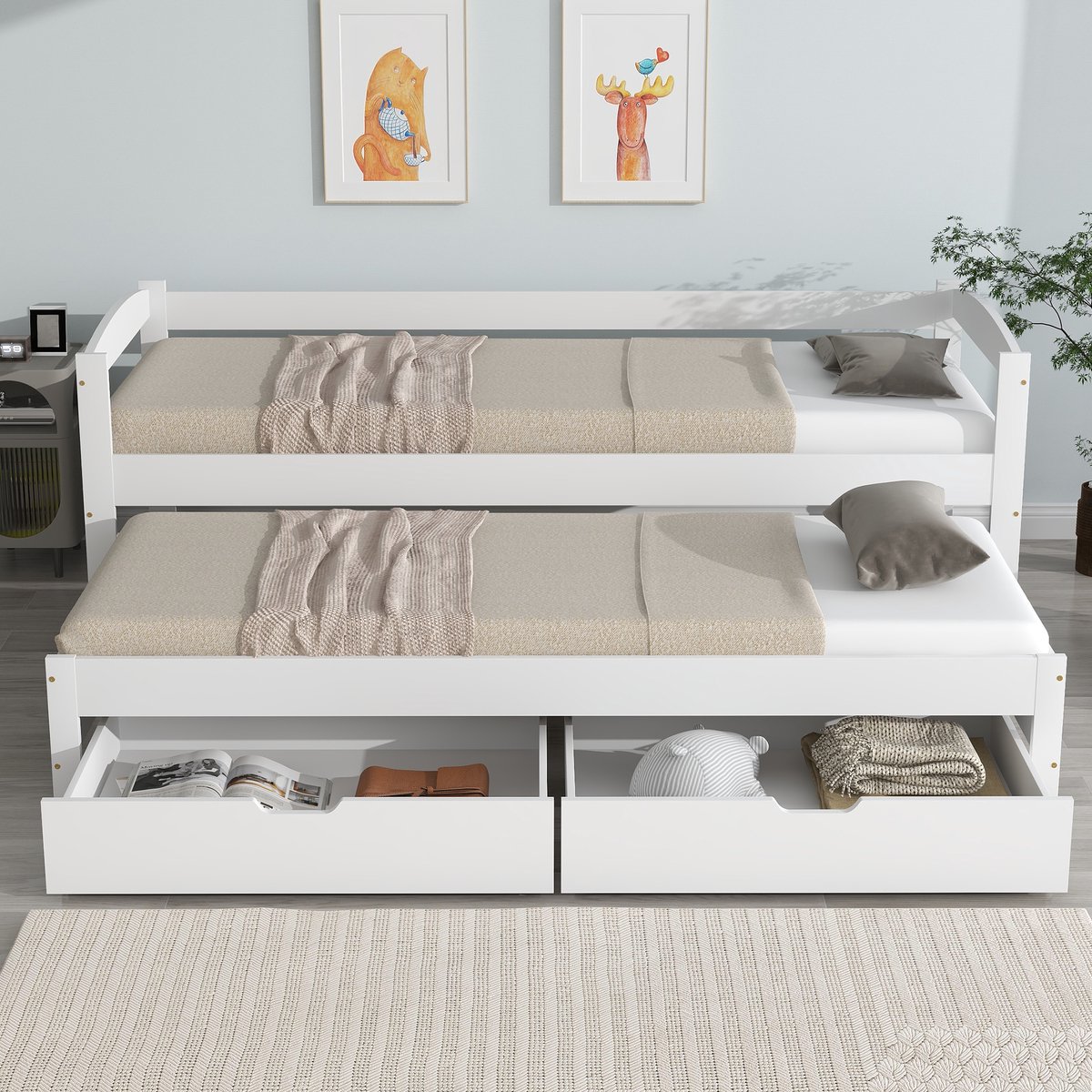 Onder het bovenste bed zit een uitschuifbaar rolbed met wielen. U kunt het rolbed apart uittrekken voor een extra slaapplaats, handig voor logees of gezinnen. Het bovenbed, rolbed en de lades zijn ook los van elkaar te gebruiken of flexibel te combineren.