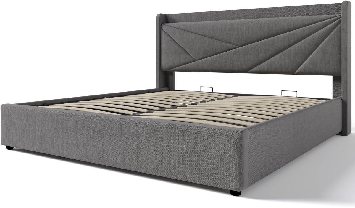 Het stijlvolle grijze linnenachtige textiel geeft het bed een rustige, moderne uitstraling die goed past in zowel klassieke als eigentijdse interieurs. Het ergonomische hoofdbord met geometrische patronen voegt visuele diepte toe zonder te overweldigen. Dankzij de zachte vulling ervaart u extra comfort bij het neerleunen of lezen in bed.