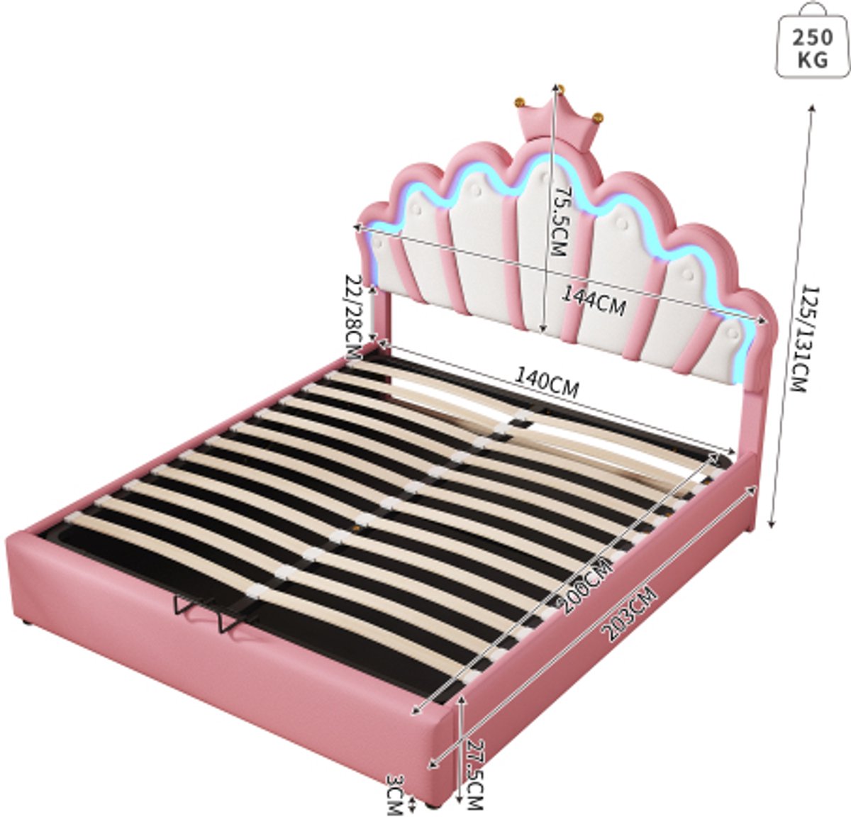 SINGULARITY-140 x 200 cm vlak bed- gestoffeerd bed- prinsessenbed- instelbare sfeerverlichting- kroonlijst- roze- zonder matras