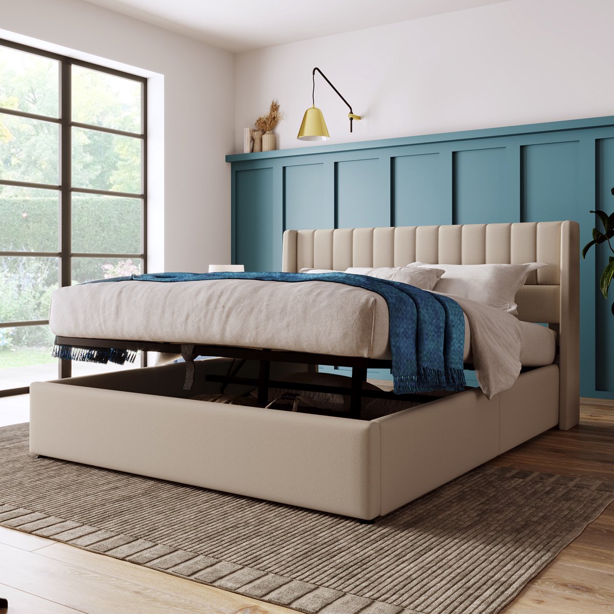 Hydraulische stang - Veel opbergruimte: Grote bedlade onder de opklapbare lattenbodem met veel opbergruimte voor dekens, kussens of beddengoed, de lattenbodem kan eenvoudig worden opgeklapt met behulp van de hefcilinder.