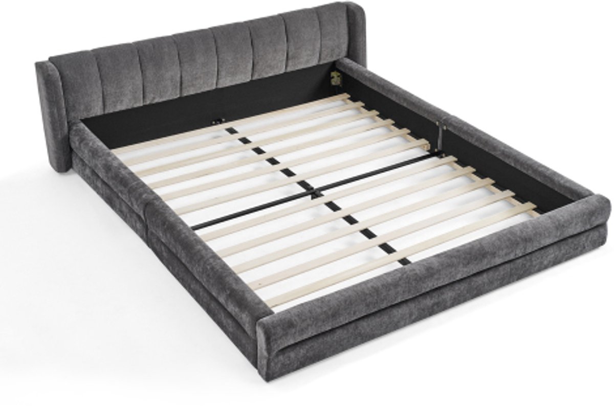 Tweepersoonsbed 160×200cm, chenille stof, comfortabele rugleuning, stevig frame van eucalyptus en ijzer, eenvoudig te monteren, donkergrijs (zonder matras)