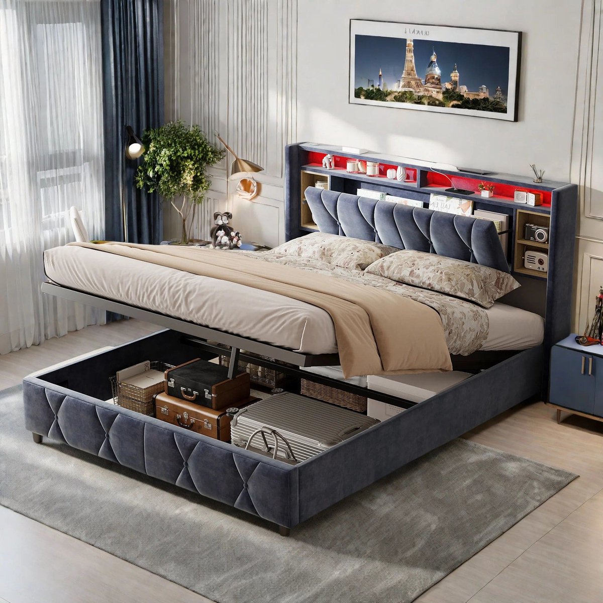 Tweepersoonsbed – Bed Met Opbergruimte – Fluwelen Bed – Slaapbank – Boxspring – 140x200 CM – Hydraulische Opbergruimte – Led Hoofdeinde Met Usb-Poort