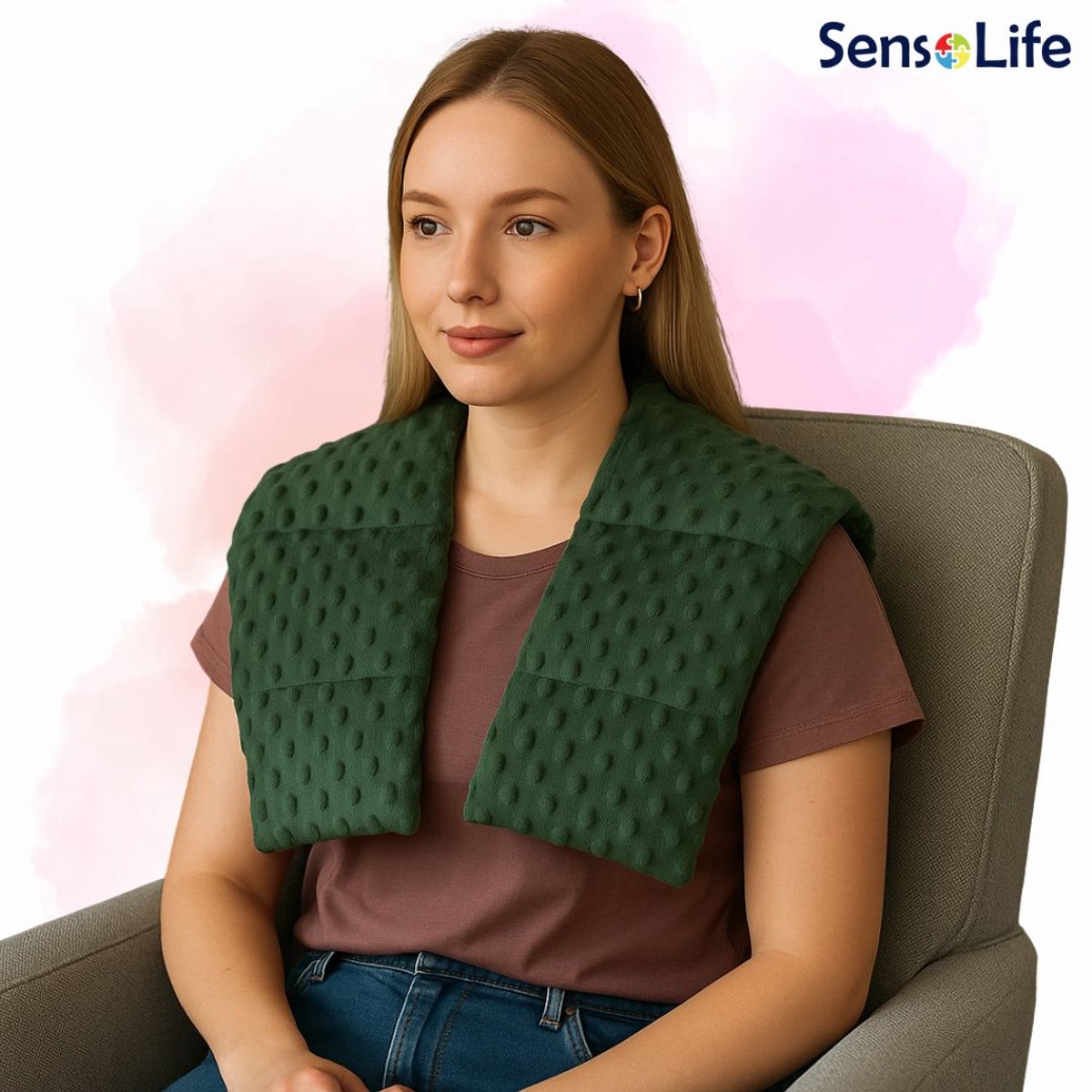 Het verzwaarde nek- en schouderkussen van SENSOLife is speciaal ontworpen om jou te helpen ontspannen en stress te verminderen, waar en wanneer je maar wilt.