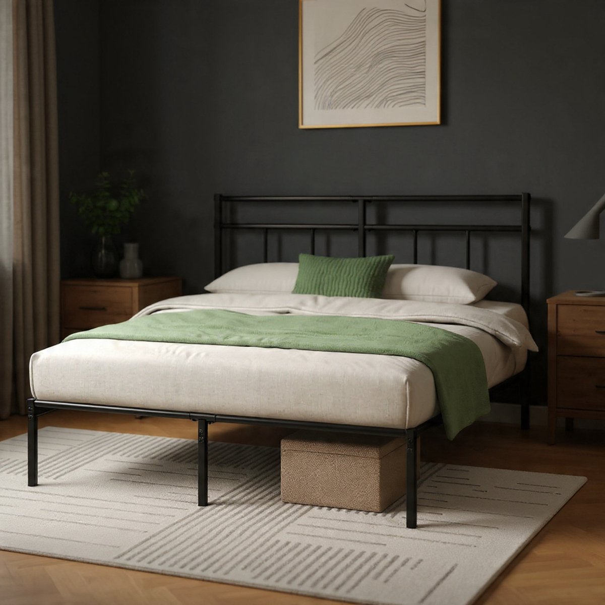 Het zwarte metalen frame geeft een luxe maar toch subtiele uitstraling die gemakkelijk te combineren is met verschillende kleuren beddengoed, dekens en slaapkameraccessoires.