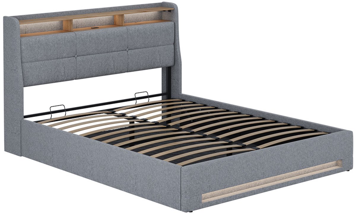 Tweepersoonsbed 140x200 cm - Gestoffeerd Bed Met LED USB-C En Hydraulische Opbergruimte - Fluweel - Grijs - Zonder Matras