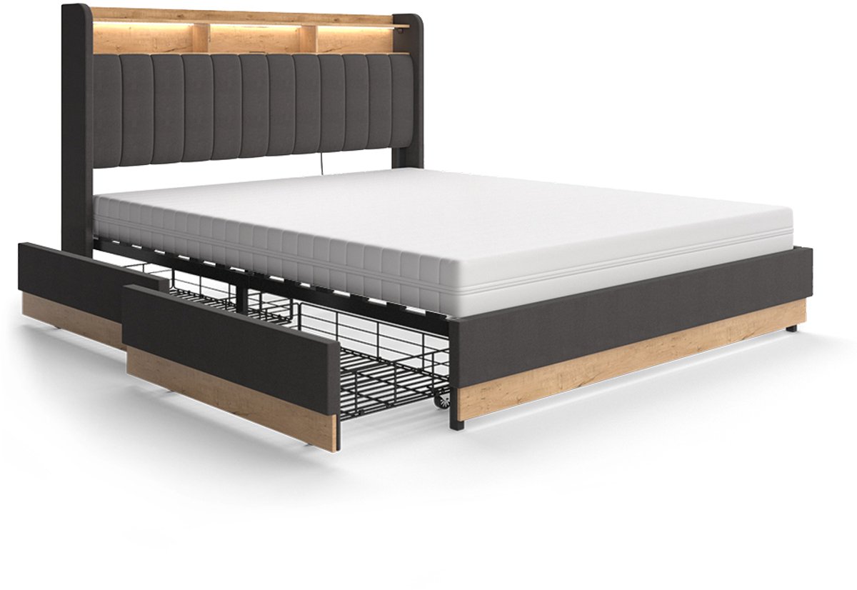 OVERZICHT VAN LEVERING: 1x bed, 1x USB-aansluiting. 1x LED-strip, 1x afstandsbediening , 4x laden met metalen rooster, 1x matras (decoratie niet inbegrepen)