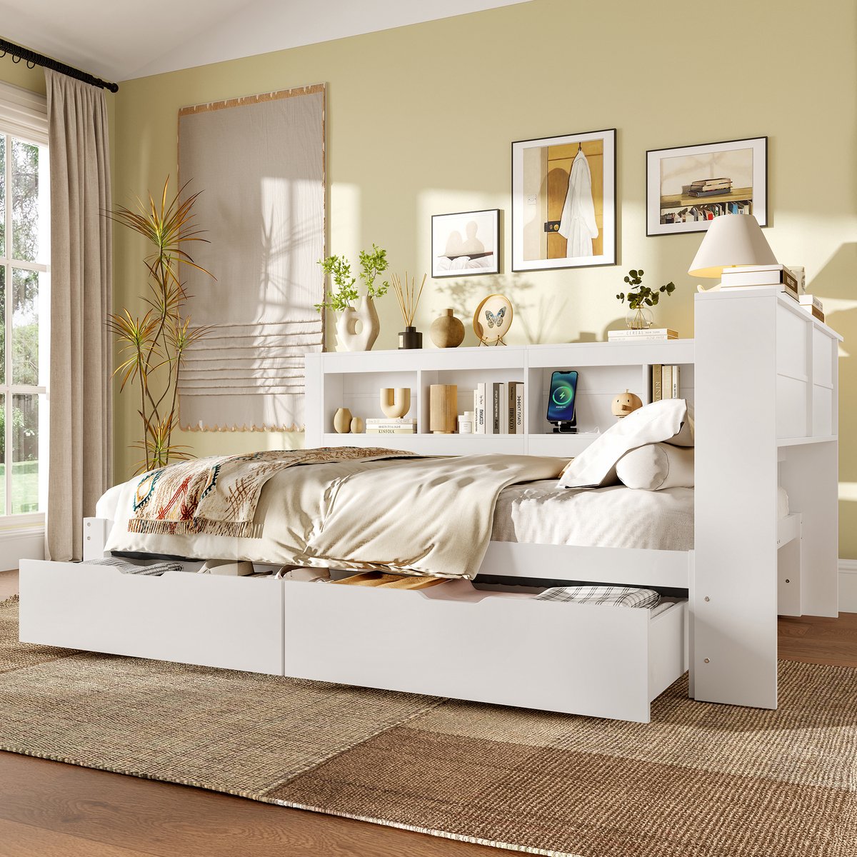 Praktische OpbergruimteAan de zijkant van het bed bevinden zich meerdere open opbergvakken. Deze vakken zijn geschikt voor veelgebruikte spullen zoals boeken en een telefoon.