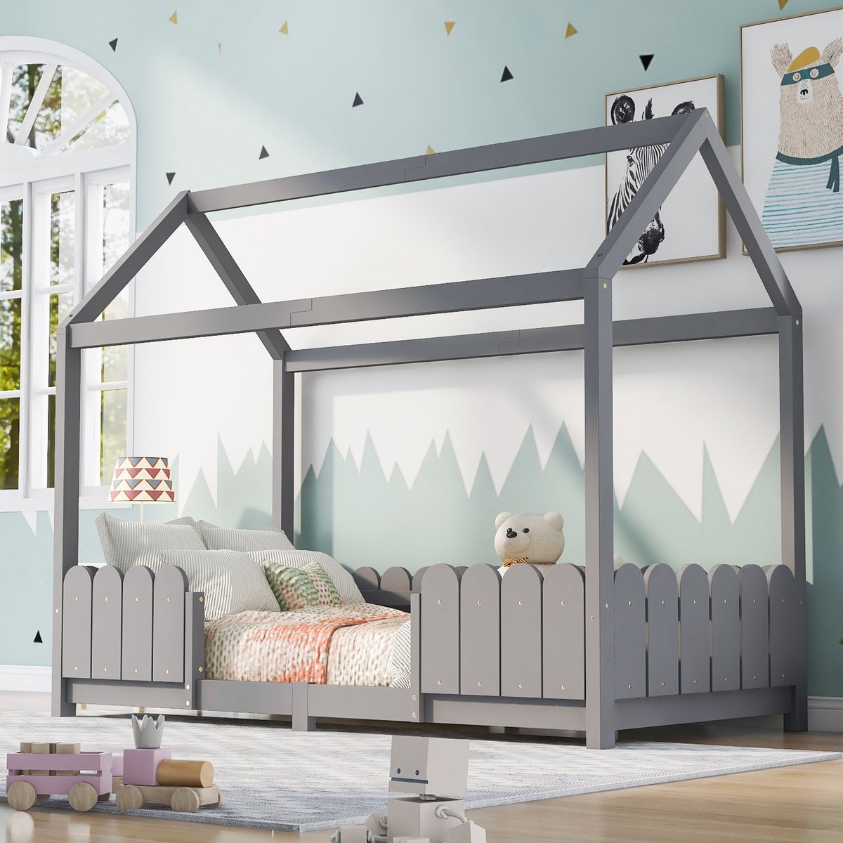 【Veiligheid】Het bed staat laag bij de grond en is daardoor geschikt als eerste grote bed voor kleine kinderen. Het zijhekje dient als uitvalbeveiliging om uit bed vallen te helpen voorkomen.