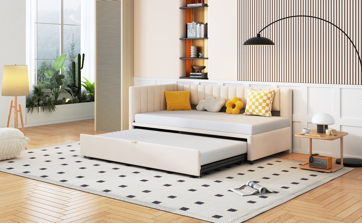 Wishdor Slaapbank In L-Vorm - Uitschuifbaar Bed - Fluweel Bekleed - Beige - 90 X 200 Cm
